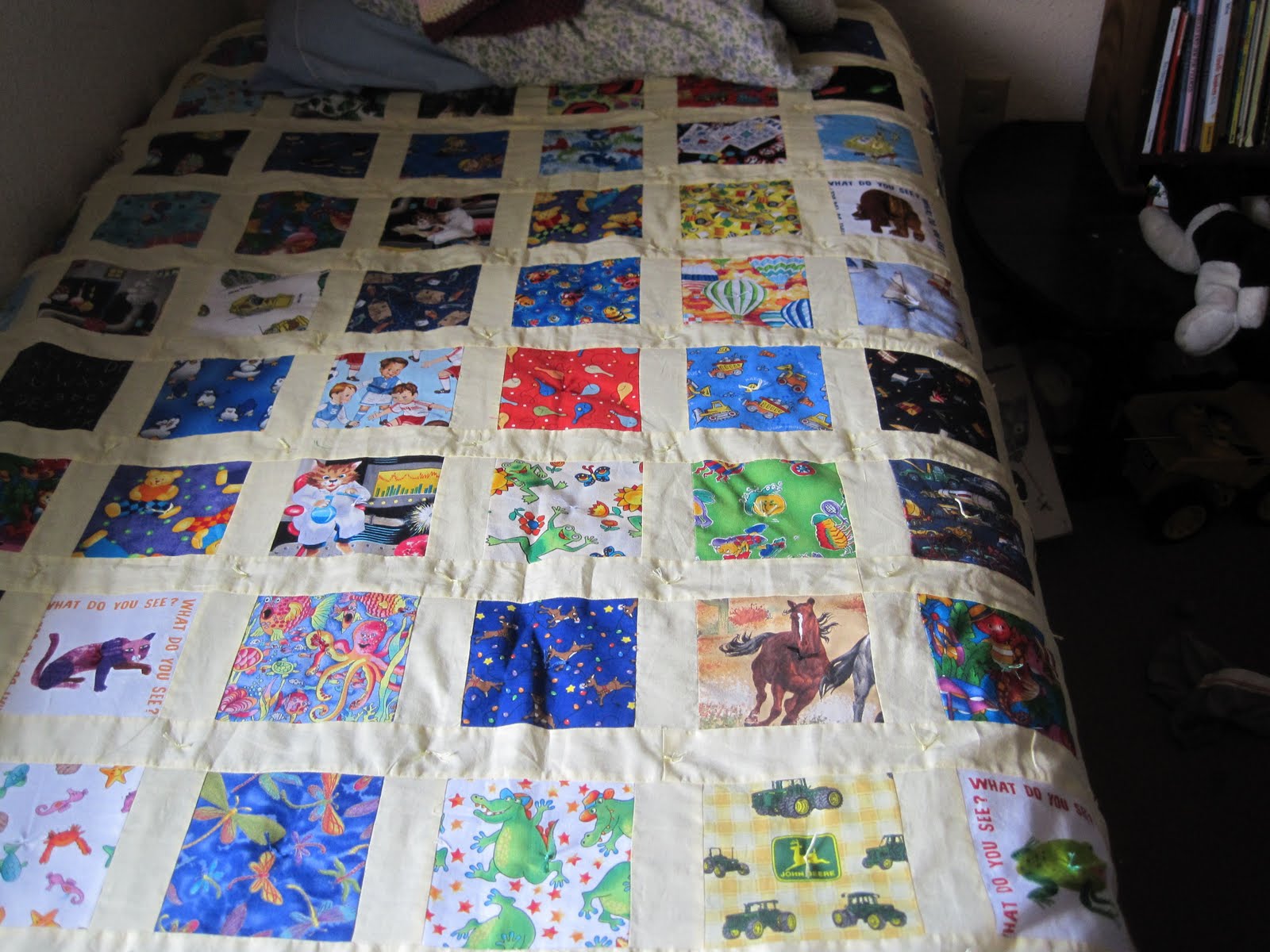 WOW, you ended up with LOTS of squares. Really cute quilt. I'll bet Ben spends hours looking at it and finding his favorite squares.